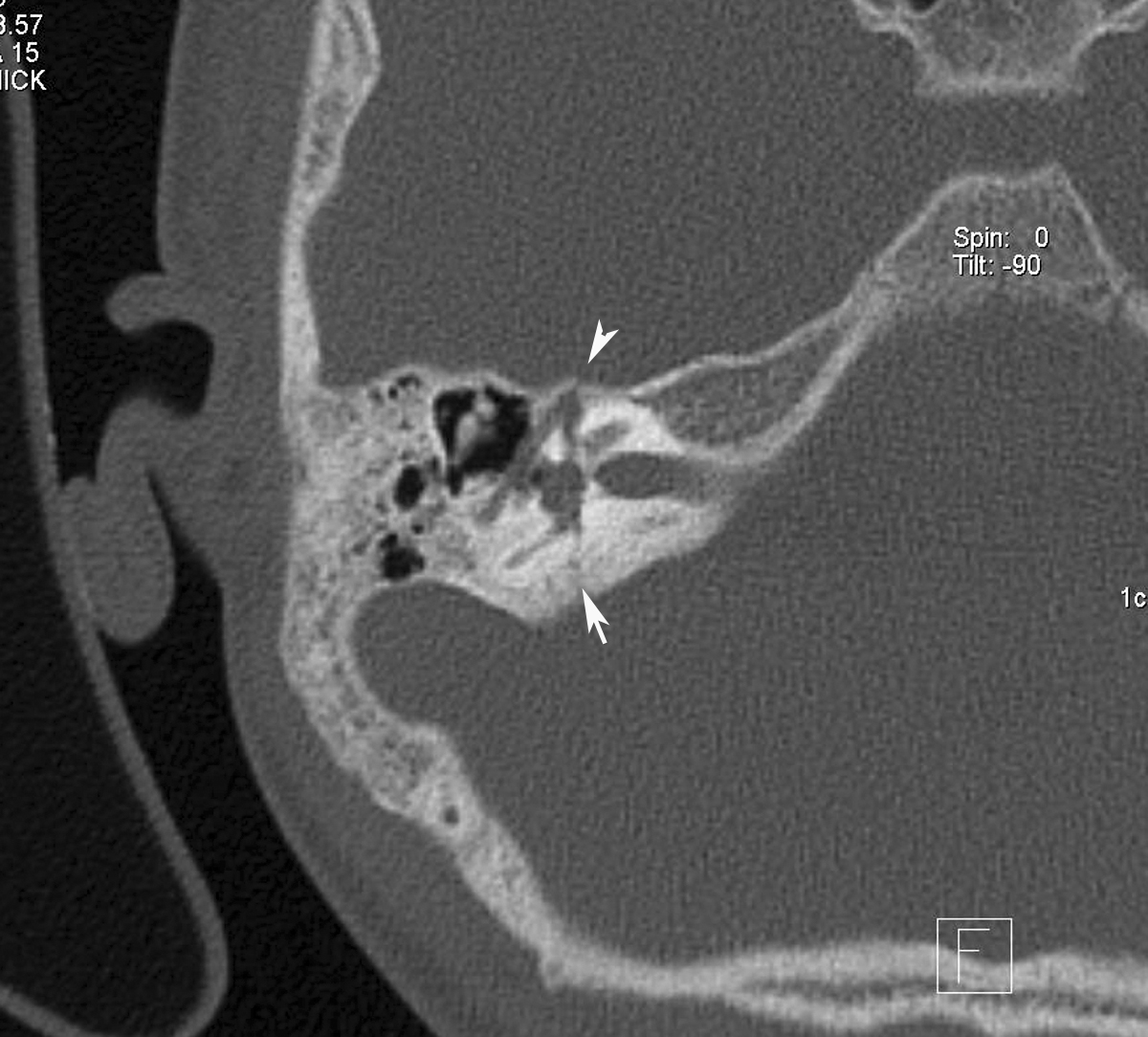 HRCT of right temporal bone axial image showing transverse temporal bone fracture (arrow) and the fracture line passing through the first anterior genu of the facial nerve canal (arrow head).